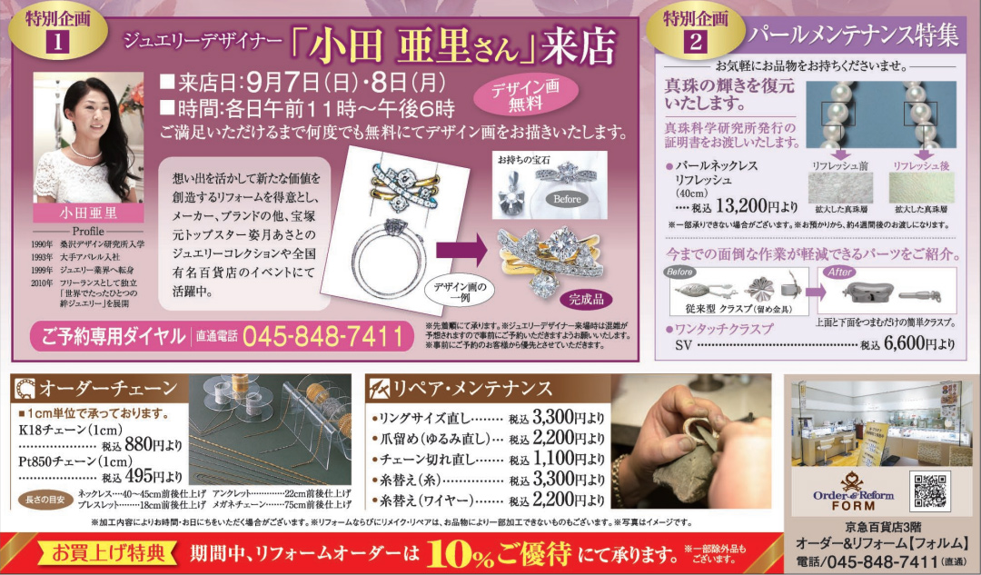 ジュエリーデザイナー小田亜里さんが上大岡京急百貨店オーダー&リフォーム フォルムに来店いたします。