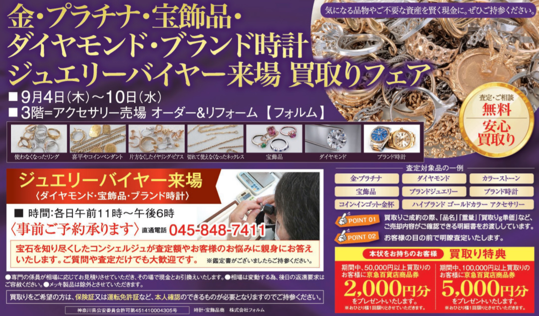 9月4日(木)~10日(水) 『ジュエリーオーダーリフォーム・地金宝飾品買取りフェア』 上大岡京急百貨店 3階 オーダー&リフォーム フォルム