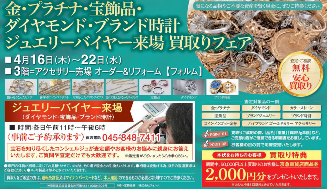 2026年4月16日(木)~22日(水)『ジュエリーオーダーリフォーム・地金宝飾品買取りフェア』 上大岡京急百貨店 3階 オーダー&リフォーム フォルム